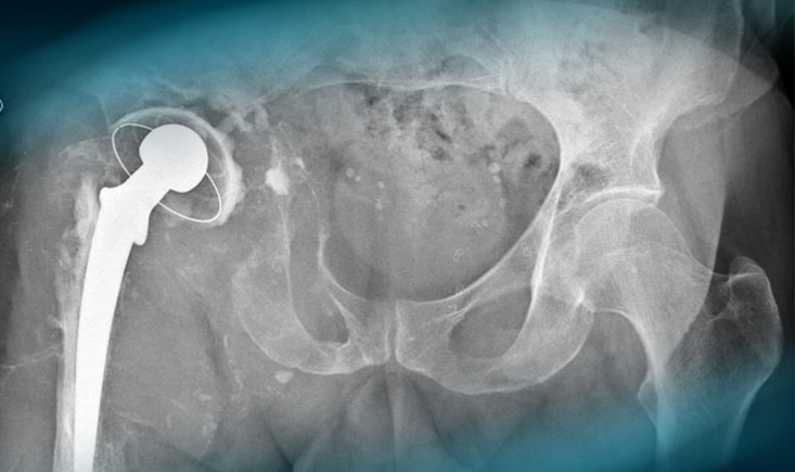 A 57-year-old man with a history of hypertension and a right hip replacement in 1993 presents with worsening right hip pain over 10 years. He uses one cane, has a 3 cm leg length discrepancy, and a soft mass in the groin.  What are your diagnostic hypotheses?