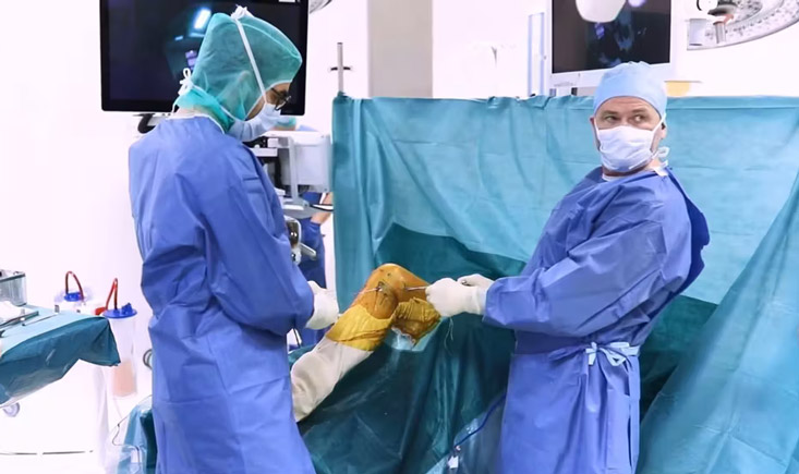 He then proceeds to perform an ACL and extra-articular reconstruction on a young soccer player, employing a more efficient, rapid, and cost-effective approach: left attached semi-tendinosus, along with anterolateral ligament reconstruction using the gracilis muscle, following the DT3 + 2 technique.